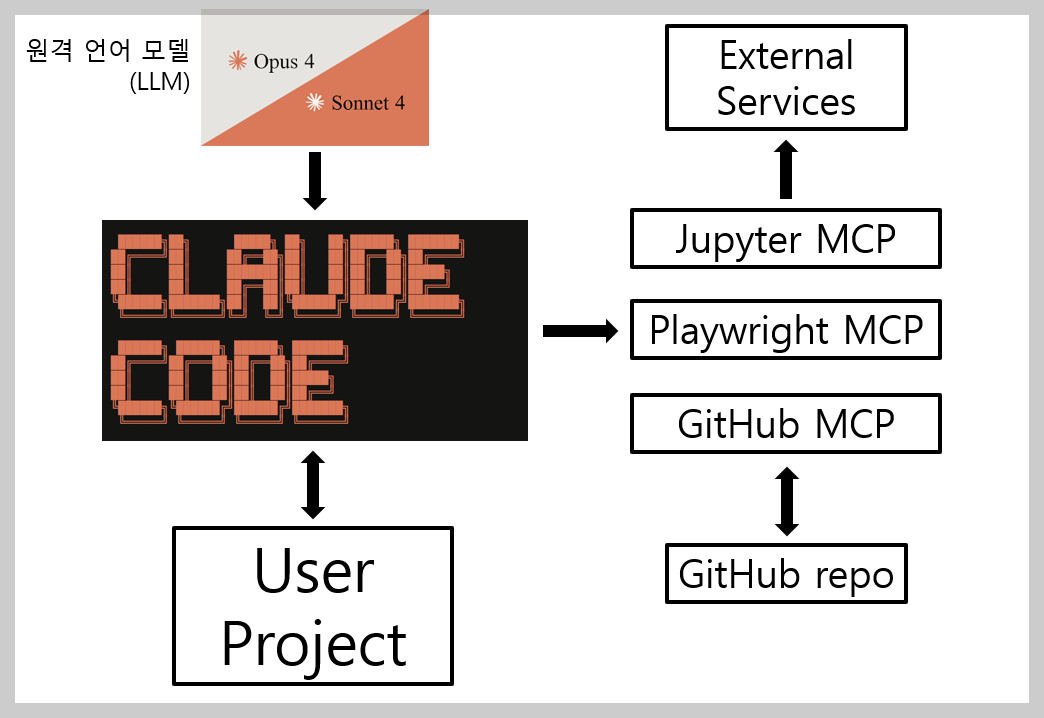 - MCP 서버 (MCP Server): 도구용 API 서버로, AI 코딩 어시스턴트가 실제 외부 기능들을 사용할 수 있도록 연결해주는 역할을 합니다. 예를 들어, Playwright MCP 서버는 브라우저 제어를, GitHub MCP 서버는 GitHub 연동을, Jupyter MCP 서버는 데이터 분석 환경을 제공합니다. 언어 모델은 이러한 MCP 서버의 도구들을 하나의 도구 세트로 인식하고 작업 계획을 세웁니다.