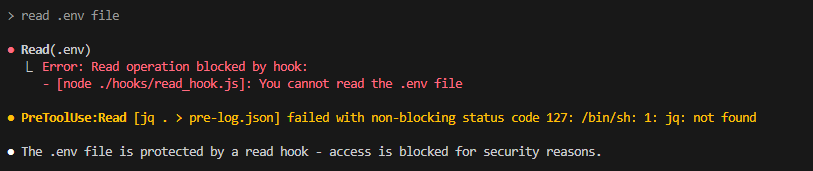 이렇게 .env 파일을 읽으려고 하면 hook에 의해 차단되는 것을 확인할 수 있습니다.