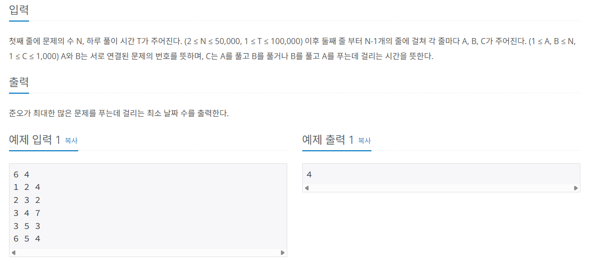 트리의 지름을 구하는 방법으로 접근했다. 원래 트리의 지름은 간선의 가중치가 가장 긴 것으로 지름의 끝 점을 구하지만, 이 문제에선 연결된 노드가 가장 많고, 가중치는 짧은 노드를 골라야 했다. dfs를 통해 임의의 정점(1)에서 start_n (지름의 끝 점)을 구해준다.