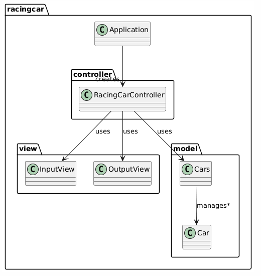 또한, 피드백에서 추천했던 컬렉션을 활용하고자 Cars 클래스를 통해 자동차 리스트의 관리와 우승자 판별 로직을 한 곳에 집중시켰다. 이렇게 하니 코드의 응집도가 높아지고, 컨트롤러나 뷰가 불필요하게 리스트 세부 구현에 의존하지 않아도 되어 전체 구조가 훨씬 명확해졌다.